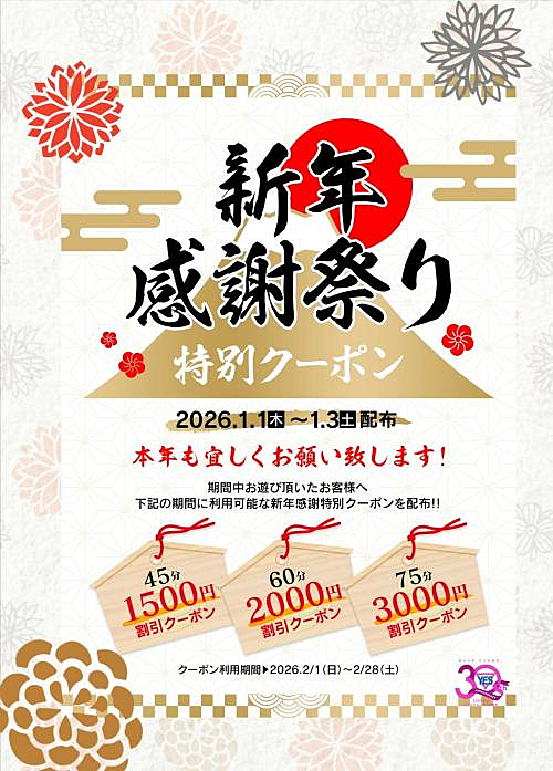 新年感謝祭り 2025年12月26日 10:00 2026年も華女は突っ走ります 1月1日の元旦から1月3日までの3日間 毎日特別クーポンを配布 クーポンをGETして 2月はお得に遊んじゃいましょう ご来店お待ちしてます