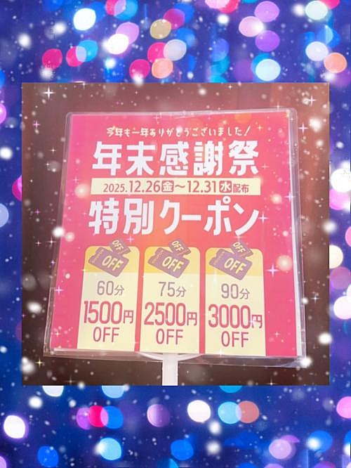 年末は華女店へ🏢💕🏃♂️💨 2025年12月26日 20:30 こんばんは🌌🌙✨️.*・゚ 今日もまた 今月のお得なイベントのご案内をさせていただきます💕🉐🤗🉐💕 12月26日(金)から31日(水)までの間は 年末感謝祭と致しまして 3種類の特別クーポンが配布されます❣️😳 是非 クーポンをゲットして 次回の時にご利用ください💁♂️🎟✨ ⚠️クーポンのご利用可能期間に注意してご利用ください⚠️ 詳細は HPをチェックしてみてくださいね🔎👀❤️🔥