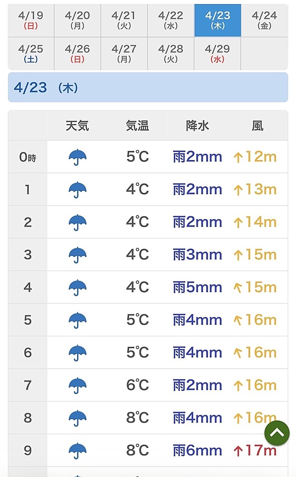 台風並みの🌀 2026年04月19日 08:57 20〜22日は予定通り決行🏔️ しかし… 山頂付近で爆風吹きやれる23.24日は 宿で湯篭りになりそう🫣 展望は望まないし雨も降ってて構わないから とりあえず歩ける範囲内の風速を 願いたいところです🥹