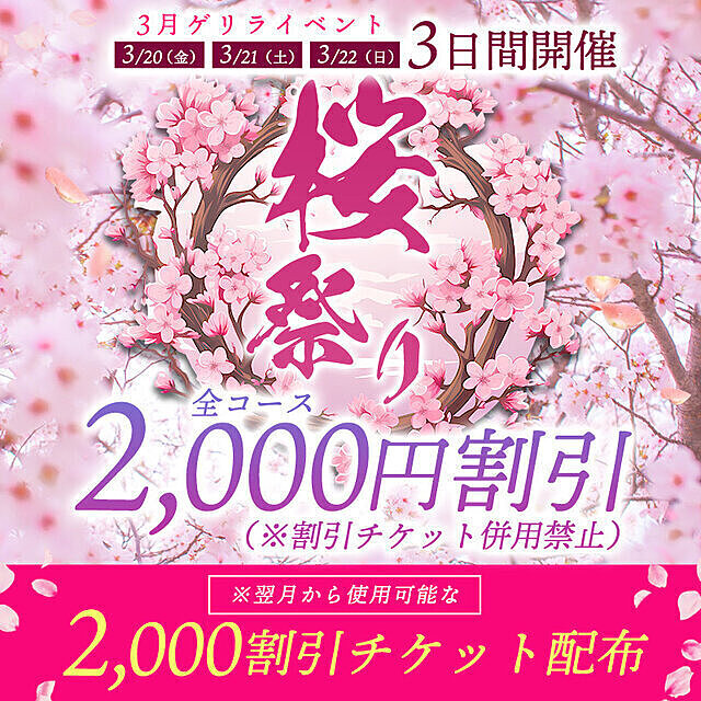 本日、最終日&ご予約ありがとう 2026年03月22日 11:16 桜祭りイベント最終日滑り込みセーフ!本日、朝からご予約ありがとうございます金曜日のご予約もありがとうお礼日記、後ほどで🙇♂️写メは、タ◯ンのマイガールにあげました全体公開の写真が無いですごめんなさい本日もよろしくね🤗