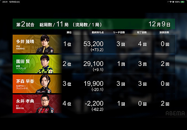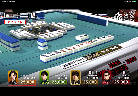 Mリーグ 2025年12月10日 08:41 昨日のMリーグMリーガーで一番知名度が高いであろうアベマズの多井隆晴プロ東1局から大暴れ一発ツモに裏まで乗って一気に倍満初っ端から4000-8000は心強いちなみに東4局でも園田プロが倍満ツモあがり倍満祭りでした