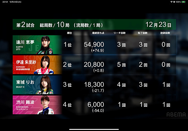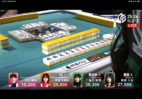 Mリーグ 2025年12月24日 08:51 23日のMリーグアースジェッツ逢川プロ3ヶ月ぶりトップオーラスが面白かった!僅差で2着の東城プロが親なので連荘は阻止したいところ千点でも和了ればトップでしたがまさかの裏裏で倍満のオーバーキル(゚д゚)アースジェッツ!の勝利ポーズ逢川プロの元気で明るいキャラはこちらまで笑顔になりますね( ´∀`)