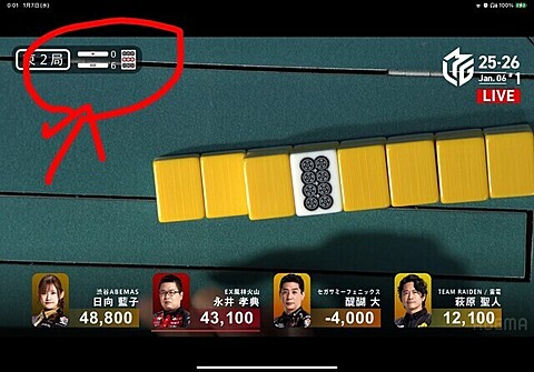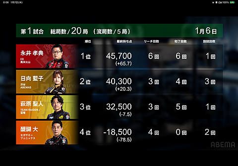 Mリーグ 2026年01月07日 09:02 風林火山の永井プロが強すぎる!東発からアベマズの日向プロがメンチン一盃口で親倍8千オールからのさらに加点で6万点超えこれは今日は日向プロで決まりだろうと思っていたら、、、永井プロの親番なんと6本場日向プロにグイグイ迫りますそして最後条件満たして和了り逆転トップ総局数20局2時間半ほどの長丁場でした(;´Д`)