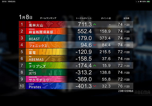 Mリーグ 2026年01月09日 08:47 1月8日時点でのチームポイントランキング風林火山と麻雀格闘倶楽部が頭ひとつ抜けてますね 下位3チームは団子状態なので試合結果ひとつで順位がガラッと変わりそうどのチームも頑張れ!( ´∀`)