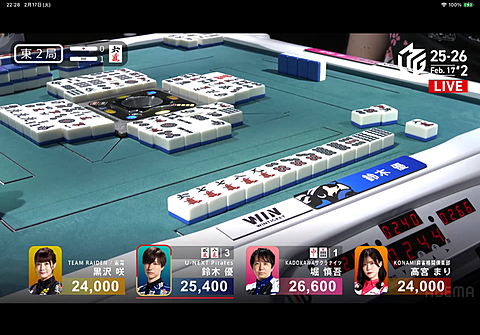Mリーグ 2026年02月19日 08:42 第2試合はパイレーツ鈴木優プロがトップハイテイ!これは脳汁ドバドバでしょう6千オール!この背中のYUがいいですね第1試合のタッキーに続いてこちらもまたイケメン優プロは謙虚で優しい喋り方で好感しかないです( ´∀`)