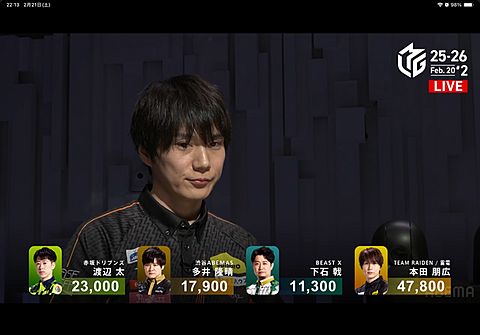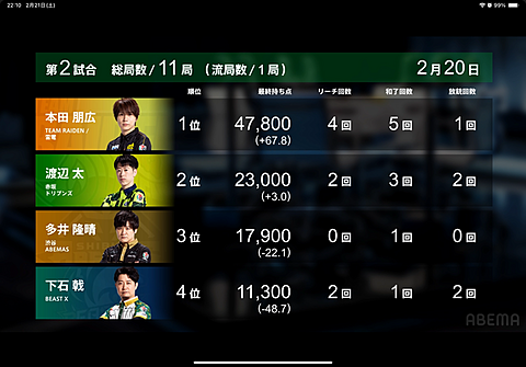 Mリーグ 2026年02月22日 08:48 雷電の弟キャラ(42歳)本田プロ怒涛の5和了でトップでも第1試合は萩原プロが4着、、、本当に雷電はトップ&ラスが多い印象Mリーグ屈指のイケメンと言われるだけあって絵面が大変良いです( ´∀`)同じ富山県出身なので応援
