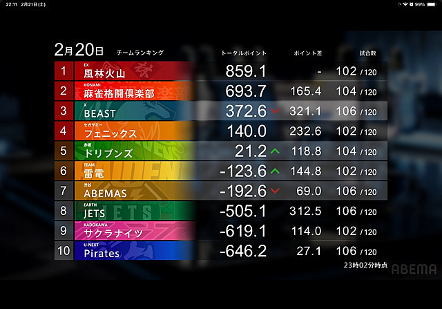 Mリーグ 2026年02月22日 09:31 20日時点でのチームポイントランキングドリブンズ、雷電、アベマズのボーダー争いといったところでしょうか下位3チームはポイント離れ過ぎてるのでちょっと厳しいかも6位までセミファイナル進出です