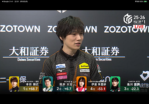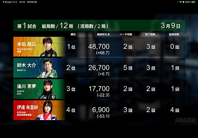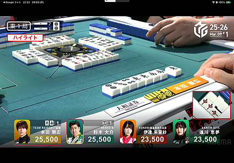 Mリーグ 2026年03月11日 08:11 3/9のMリーグ苛烈なボーダー争いの雷電東発から親の本田プロがダブ東白中ホンイツドラの6千オールこのままトップを守りきりましたチーム状況を考えてかいつものヤンチャ麻雀ではなく我慢して降りるところも見受けられましたいつ見てもイケメンです