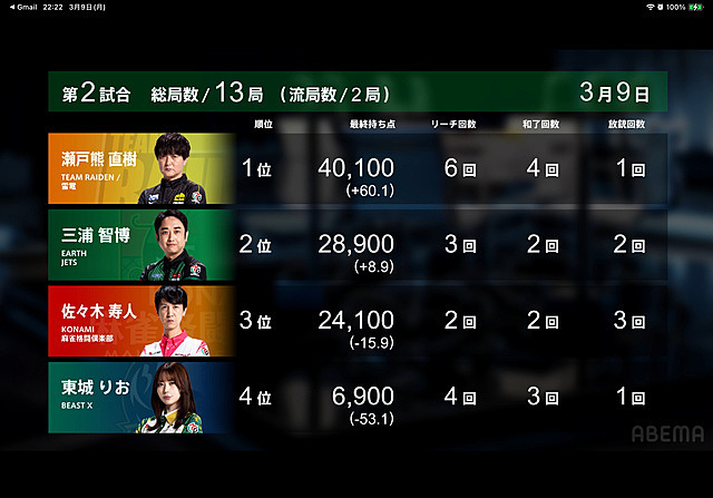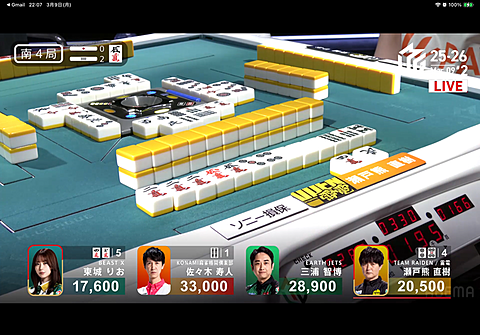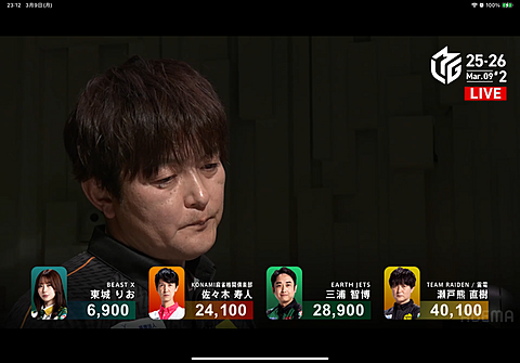 Mリーグ 2026年03月11日 08:24 第2試合本田プロに続いて瀬戸熊プロがトップ!オーラス時ラス目の親番瀬戸熊プロ2本場で会心の親ハネ1万6千一気に大逆転!めちゃくちゃカッコいいよ瀬戸熊プロ(>_<)雷電デイリーダブルおめでとう!