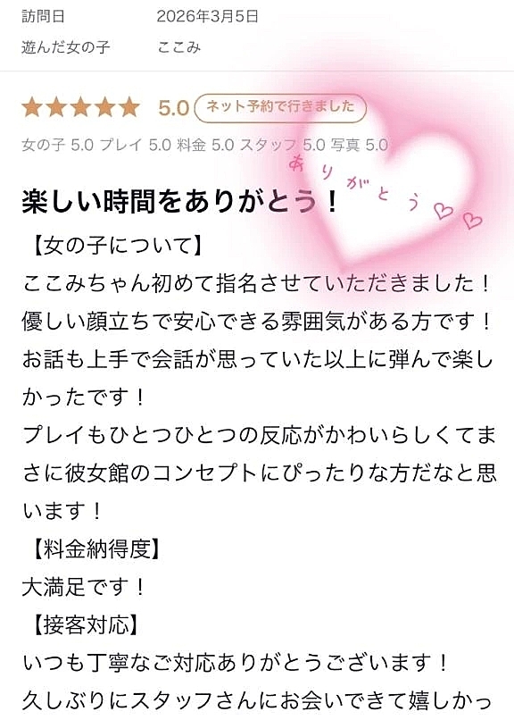【お礼写メ日記】 2026年03月06日 12:55 💓ヒデマルンルン様💓ラブレターありがとう🥹♡安心できる雰囲気があるなんて、、嬉しい😭😭💕私も大好きなディズニーの話でRくんがお話し上手過ぎたのもあり😂私もすごく楽しい時間でした✨✨時間があればずーっと私達マシンガントークできそうだね🤭♡遊び来てくれてありがとう💓またお話ししようねここみ🎀