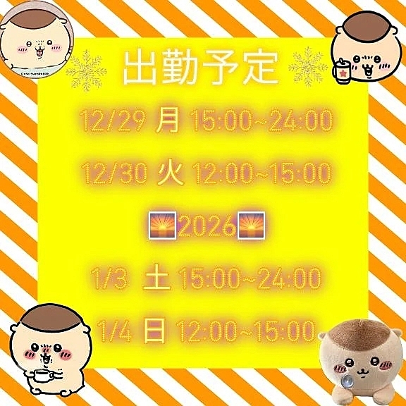 年明けは3日から24:00まで出勤しますのでよろしくお願いいたします🥰💕