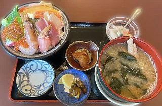 お昼は海鮮丼にあら汁![]()