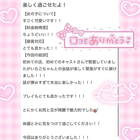 💌口コミthx💌 2026年03月28日 20:21 口コミありがとう可愛いって言ってもらえて幸せ🙈︎💕︎おしりと足も褒めて貰えた🦵🍑💗楽しかったなら良かったしいちごも楽しかったよ〰️🥹💗また是非遊びに来てね💗