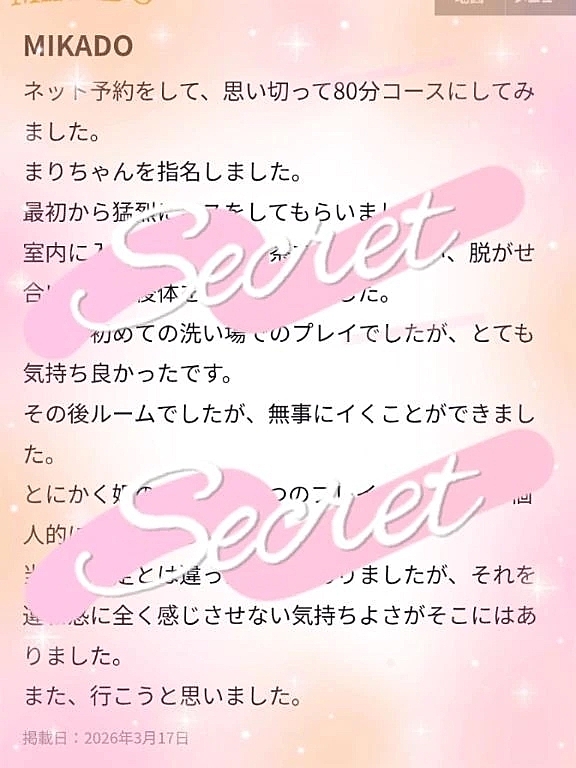 💌【お礼写メ日記】 2026年03月17日 20:49 口コミありがとうございます💌🥰80分にしてくれたからこそのマ○ト&ベ○トが出来て良かったです🫶✨初めてのマ○トは緊張もあったと思うけど気持ち良かったって言ってもらえて嬉しいです( *´꒳`* )💕予定や想像と違うこともあると思うけどどんなときでも楽しくえ○ちに過ごせたら嬉しいね🫶本当にありがとう⸜( *´꒳`*)⸝