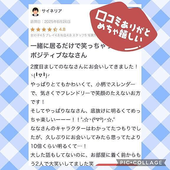 【お礼写メ日記】 2025年06月27日 15:41 こんにちは♪昨日久しぶりに会えて嬉しかったです遊びに来てくださってまた口コミも書いて頂きありがとうございますマットもベットもめちゃ笑いが止まらんね笑楽しいお時間一緒過ごしてくださってありがとうまたお会い出来るの楽しみに待ってまーすなな