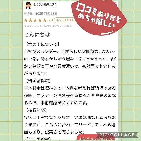 【お礼写メ日記】 2025年09月29日 21:01 いつも遊びに来てくださって口コミまで書いて頂きありがとうございます楽しいお時間一緒に過ごしてくださって楽しかったです♪またお時間できたらぜひ遊びに来てね❣️楽しみにお待ちしてまーす(*≧∀≦*)なな
