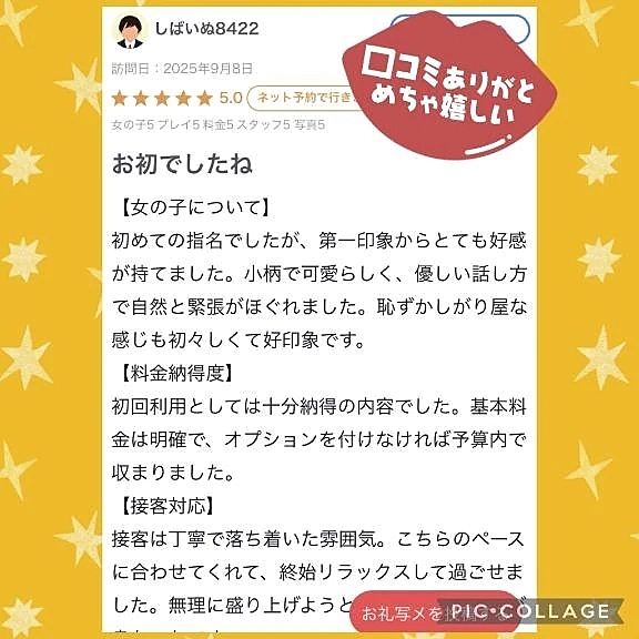 【お礼写メ日記】 2025年09月29日 21:06 9月8日ご来店でお初で遊びに来てくれて口コミまで書いて頂きありがとうございました初めてな感じがなかったよね(*≧∀≦*)笑また遊びに来てくださってありがとうございますいつも楽しいお時間一緒過ごしてくださってありがとうまたお会い出来るの楽しみに待ってまーす\(//∇//)\なな