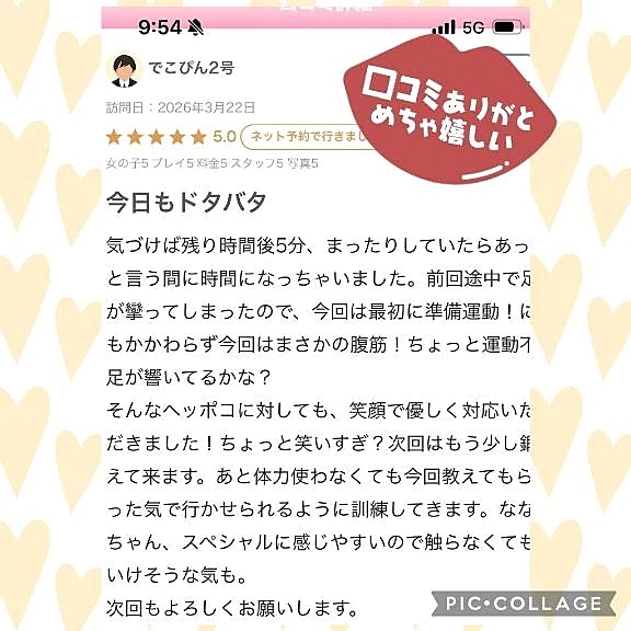 【お礼写メ日記】 2026年03月23日 18:26 いつもお時間作って遊びに来てくださって口コミも書いていただきありがとうございます準備運動してバッチリだったはずが、、、まさかの次回はお腹つったことがなかったので勉強になりました❗️ツボってしまいごめんねまたお会い出来るの楽しみに待ってまーす(*≧∀≦*)なな