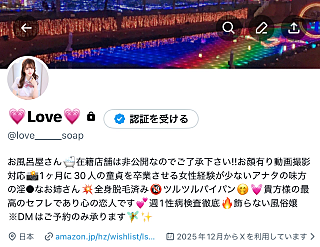 ?(重要)?Xアカウント? 2025年12月19日 12:03 X(Twitter)凍結したので新しいアカウントになります(????????)�II"?@love_____soap?Xでは今思っている事とかお休みの日の出来事とかとても私らしい発信が多いので?少しでも興味を持ってくれたお兄様がいらっしゃったら是非覗いてみて下さい????出勤予定が出た際はリプライなどでやりとりも出来ますし姫予約等も可能です( ????艸???? )?? 女の子ページへ