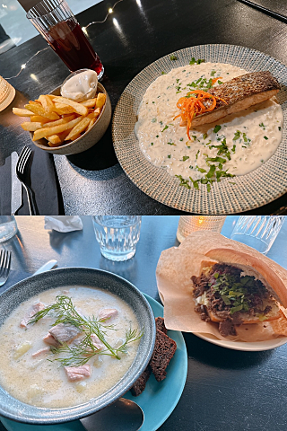 フィンランドはサーモンとトナカイ肉が有名なので、グリルサーモンのレモンリゾット、サーモンスープ、トナカイ肉のサンドを?