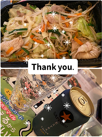 一緒にお酒で乾杯しながら肉野菜炒めまで
