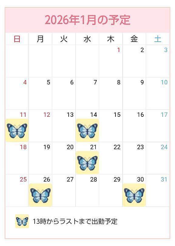 1月出れるかもしれない日程です? 2025年12月27日 22:03 中旬から後半にかけて13時からラストまでで予定してます?会いに来れるお兄さん来月予定空けて会いに来てくれると嬉しいです?出勤増えたり減ったりしたときもまた日記で報告します??女の子ページへ