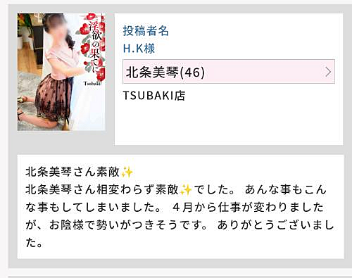 H.K様へ♪ 2026年04月06日 21:03 こんばんは 昨日も楽しい時間をありがとうございました たくさん褒めていただけて、とても嬉しいです そして、あんな事もこんな事もしていましたね 楽しかった〜 4月からお仕事が変わると聞いてびっくりしましたが、新しい制服を着て頑張っているH.K様を想像して心の中で応援しています またお時間が空きましたら逢いに来てくださると嬉しいです ではではまたお逢い出来るのを楽しみにしています