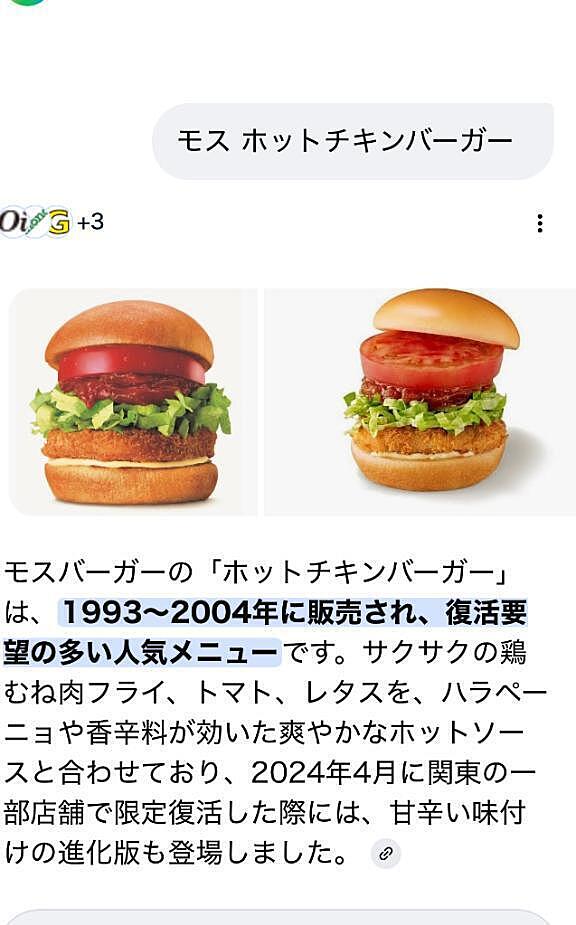 [お題]from:結局ビッグマックさん 2026年03月12日 22:01 お題:今日は「モスの日」なんのハンバーガーが好き?に回答♪ ホットチキンバーガー????復活して欲しい-?第一号店って、日大の校内って、日大に友だちから聞いたことある-!ファストフードで高校サボるの定番??女の子ページへ