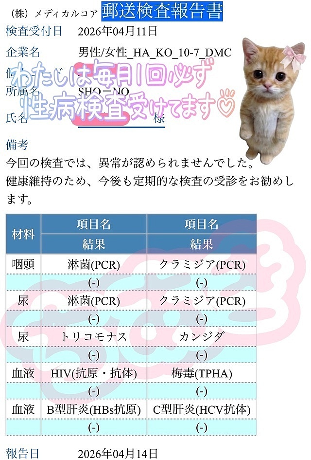 今月の性病検査も無事クリア!!