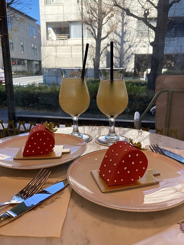 このケーキ、いちごの形ですっごく映えるよね💖ひよりはカフェ巡りもだーいすきなの🌟