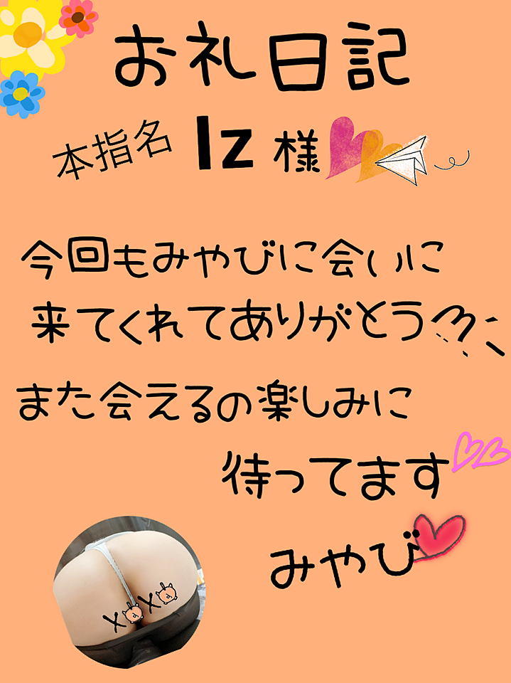お礼日記☆3月21日(土)☆ 2026年03月21日 23:19 本指名IZ様*¨*. 今日は久しぶりに会いに来てくれて ありがとうございました〜! 久々に会えて安心&嬉しかったよ〜! 足腰が痛そうなのが気になっちゃったけど早くよくなると良いな〜。 今回も沢山のおみやげとHな下着もありがとうございます☆ また、逢いに来て貰えるの楽しみにしてます☆ みやび