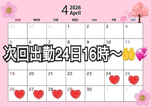 次回出勤明後日~🤲💞 2026年04月22日 18:19 こんばんはっ🍀今日も1日お疲れ様です❣️✨️✨️次回出勤24日16時~です(๑•̀ㅁ•́ฅ✨Mット好きさん💓M男さん💓是非✨お待ちしております🙋♀️❤️溜まった疲れ沢山出しに来て(⸝⸝⸝¯👅¯⸝⸝⸝)💕私が行くまで待っててね(*´∀`)σ)д`*)