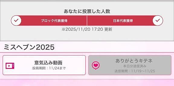 日本代表獲得? 2025年11月20日 17:27 ??こんばんは? やばいっ!!!!目標にしてた投票者数200人以上突破して日本代表獲得できたあああああ(´;ω;`)??まだ3日目なのに....めちゃくちゃ嬉しい??本当にありがとうございます???♀?順位は投票数なので引き続き投票応援よろしくお願いいたします(*´`)?女の子ページへ