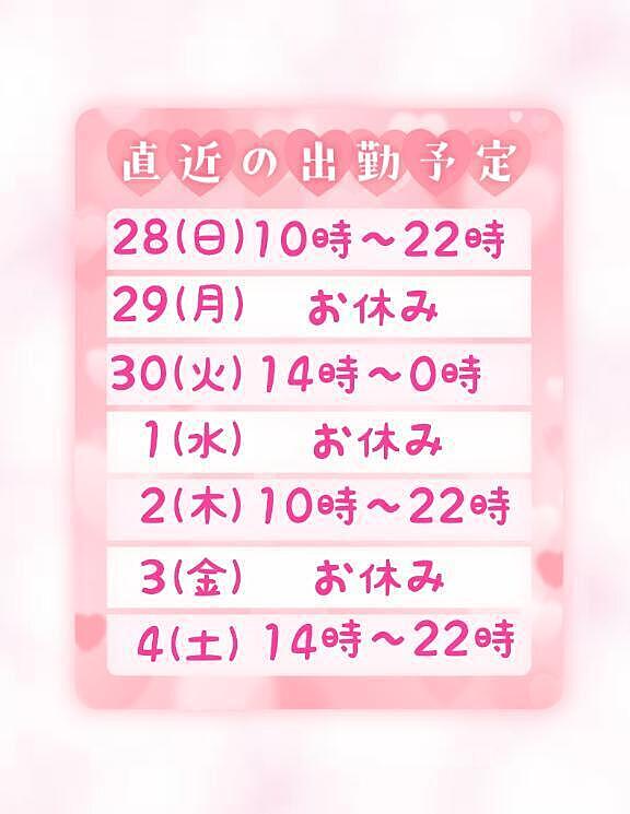出勤予定のお知らせ? 2025年09月27日 13:01 こんにちは!すずです?出勤予定のお知らせです!日程は画像の通りです?お時間の合うお兄様いらっしゃいましたらお誘いお待ちしてますね? 女の子ページへ
