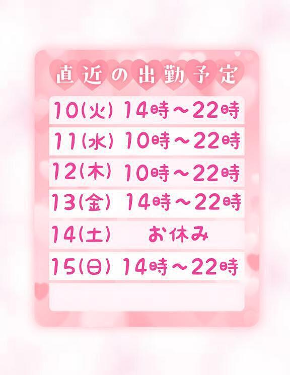 出勤予定のお知らせ? 2026年02月09日 20:03 こんばんは!すずです?出勤予定のお知らせです?日程は画像の通りです?お時間の合うお兄様いらっしゃいましたらお誘いお待ちしてますね??女の子ページへ