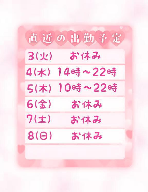 出勤予定のお知らせ? 2026年02月28日 22:31 こんばんは!すずです ?出勤予定のお知らせです?日程は画像の通りです!お時間の合うお兄様、いらっしゃいましたらお誘いお待ちしてますね?3月初週は予定が重なっちゃってて明日と水曜と木曜しか出勤出来なくてごめんなさい?また何か変更等あったら?日記にてご報告しますね??女の子ページへ