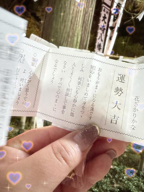 あけましておめでとうございます? 2026年01月01日 17:04 新年あけましておめでとうございます?わざわざトークくれたお兄さんたちもありがとう???年明け早々、初詣に行ってきました??おみくじの結果は大吉??(短気をいましめて身を慎み…って思い当たるので気をつけます?)今年も幸せな1年になるといいなぁ…??明日以降の事前予約もお待ちしてますね??れい女の子ページへ