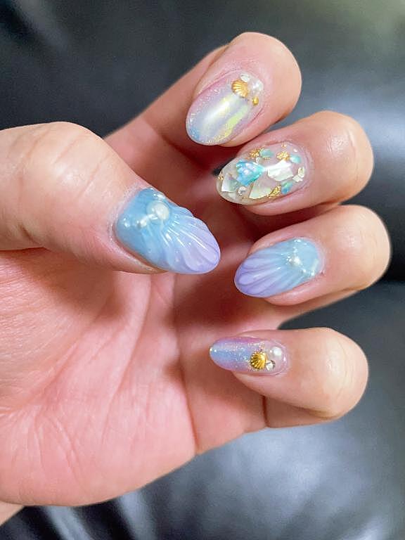 [お題]from:カワヨさん 2026年02月19日 21:24 お題:今日は「ネイル女子の日」お気に入りのネイル見せてください!に回答♪今までやったことあるネイルの中だと派手めのマーメイド、シェルネイルがお気に入りでした??その時の気分でキラキラで派手なものからシンプルなデザインのものまで幅広くやります??パーツはいろいろと邪魔になるからあんまりつけない派です(*�I%ω�疋)�IIれい女の子ページへ